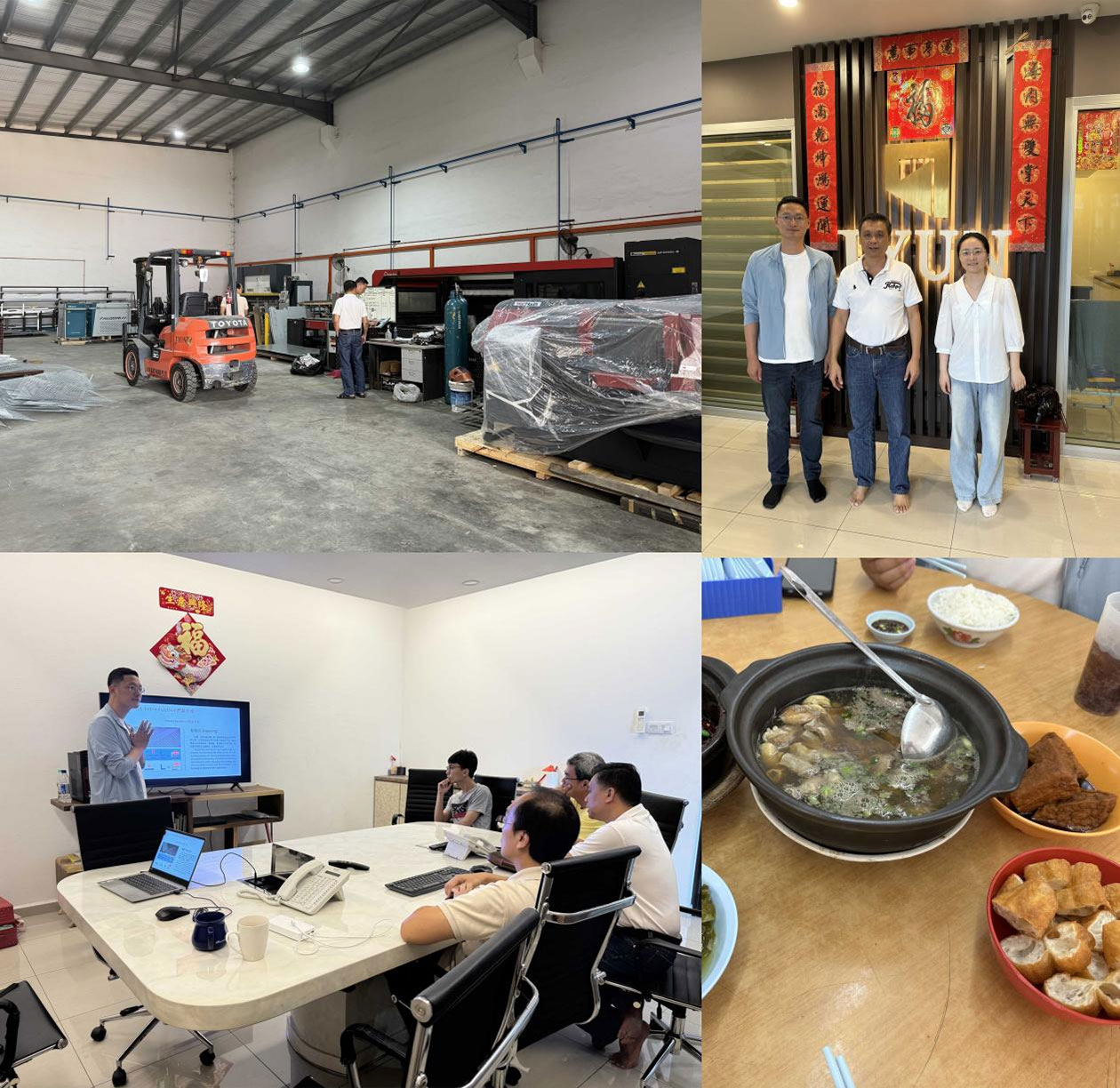 受到客户的热烈欢迎,JIANMENG团队应邀前往客户家中用餐,并品尝了正宗的肉骨茶。在这种轻松友好的氛围中,双方的关系更加紧密。随后,客户带领团队参观了他们的生产车间,详细介绍了他们的产品线和制造工艺。通过这次实地考察,JIANMENG团队对客户的商业模式和技术需求有了更深入的了解,为未来提供量身定制的解决方案奠定了坚实的基础。