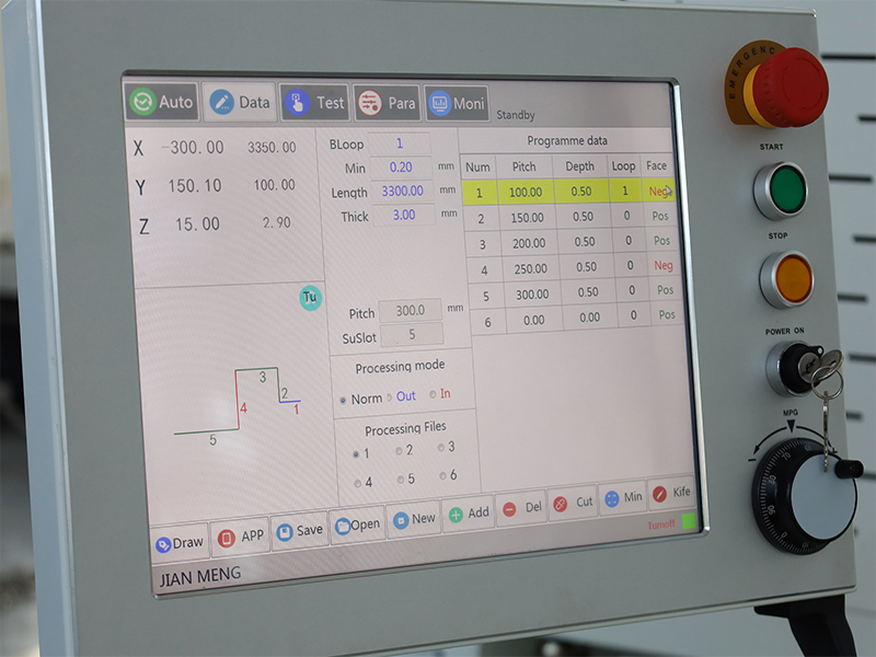 简盟立式V型开槽机采用框架式结构与低合金、高强度结构钢工作台,一体式底膜一次成型,可在镜面板材上加工而不留痕;整机经电炉回火消除焊接应力,并通过进口数控立体加工中心一次装夹成型,确保各安装面平行垂直;喷砂处理保证涂装品质;工作时刀架保持静止,由后送料驱动板材运动,准确控制槽深与槽距,整体刚性优异,耐用稳定。